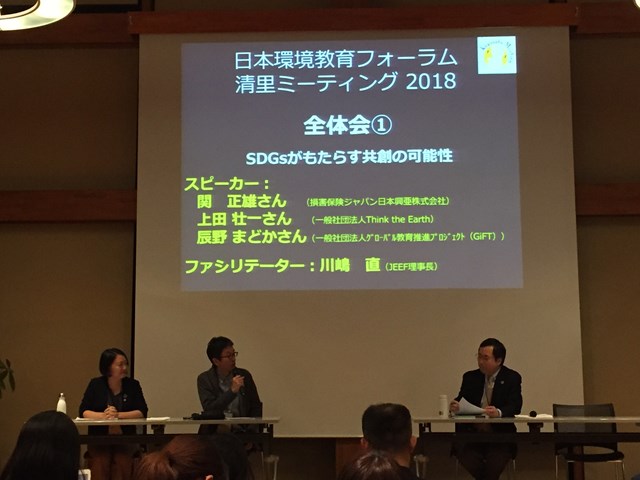 皆さん、こんにちは。 損保ジャパン日本興亜環境財団の佐藤です。 11月16日~18日、公益社団法人日本環境教育フォーラムが主催する 環境教育のイベント、「清里ミーティング」に参加してきました。 32回目となる今年のテーマは「ESD+SDGs~未来を変える教育を考える」。 全国からNPO、自治体、企業、公共団体、学校、大学生など200名近くが集まり、 SDGs達成に向けた取組を発展させていくためには何をすべきなのかを議論しました。 パネルディスカッション、ワークショップを通じた意見交換では、 立場からの異なる様々な意見を聞くことができ、 また懇親会を通じて新たなつながりを持つことができました。