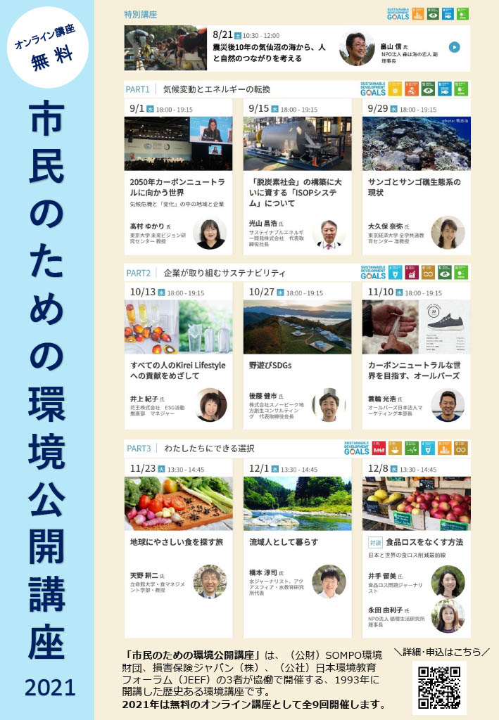 皆さん、こんにちは。 SOMPO環境財団の斉藤です。 気がつけばもう7月、今年も半分終わってしまいますね。 コロナ禍で外出もままならない今日この頃。 しかし、いつまでも下を向いてばかりはいられません! こんな時だからこそ、オンラインセミナーを活用し 様々な環境問題に関する学びを深めてみませんか? 今年で29年目を迎える「市民のための環境公開講座」は、 市民の皆さんと環境問題について考え行動していく講座です。 今年は「通年講座」(全9回)のほかに、現地中継も含む「特別講座」も開講します! 皆さんのご参加をお待ちしております! 市民のための環境講座お申込みはこちら