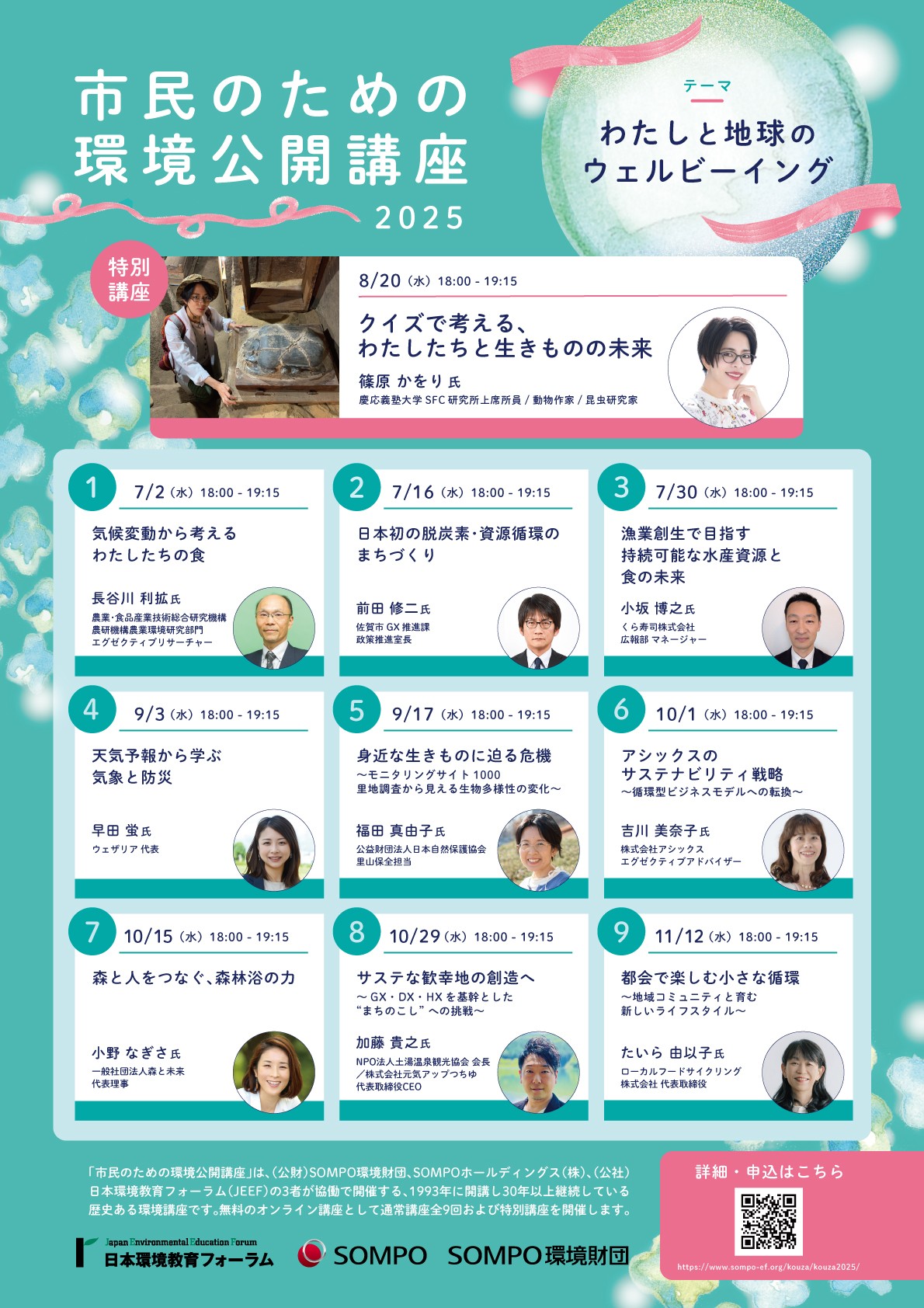 佐賀市清掃工場では、立地住民に喜ばれる施設へと変えていくために、 廃棄物系バイオマスを資源化し、誘致企業で利活用する取り組みを進めているそうです。 講座のダイジェスト記事は、SOMPO環境財団のホームページに順次掲載いたします。 ぜひどうぞご覧ください。 SOMPO環境財団ホームページ ※市民のための環境公開講座は、特別講座を含む全10回の講座を オンラインセミナー形式で開催しています。 詳細、参加お申込みはSOMPO環境財団の公式ホームページをご確認ください。
