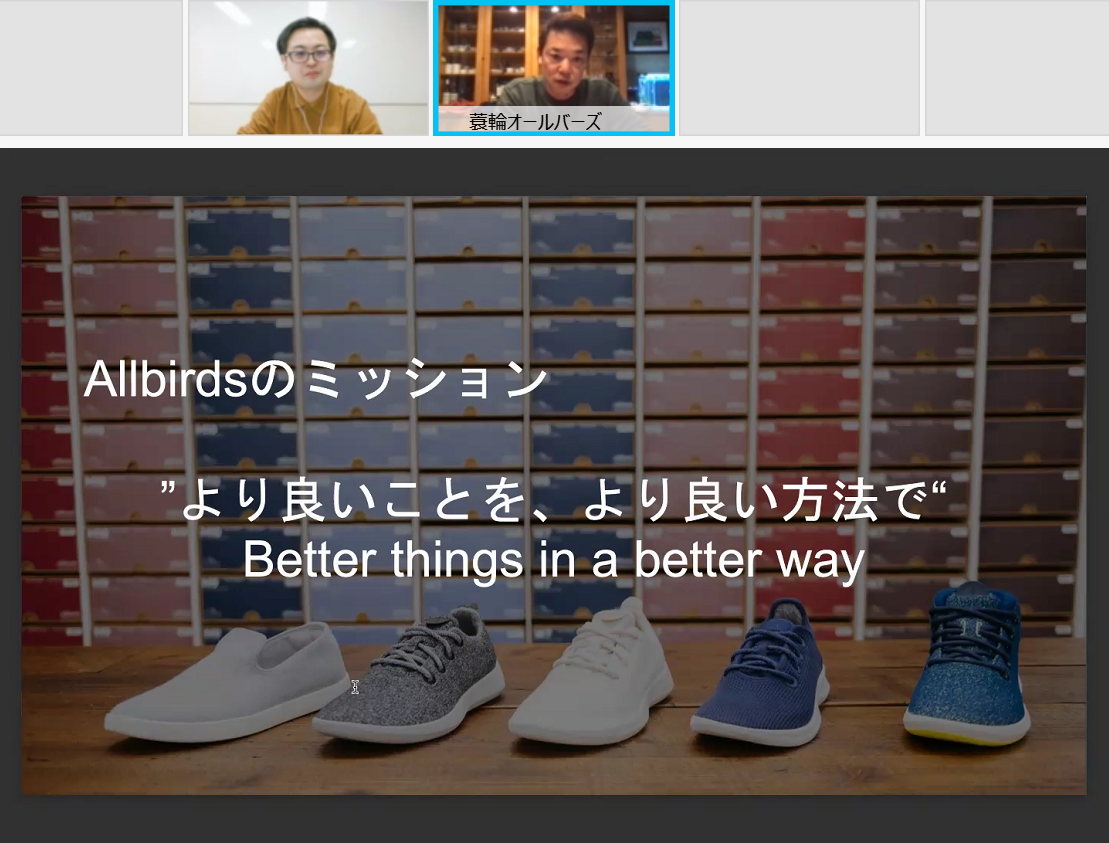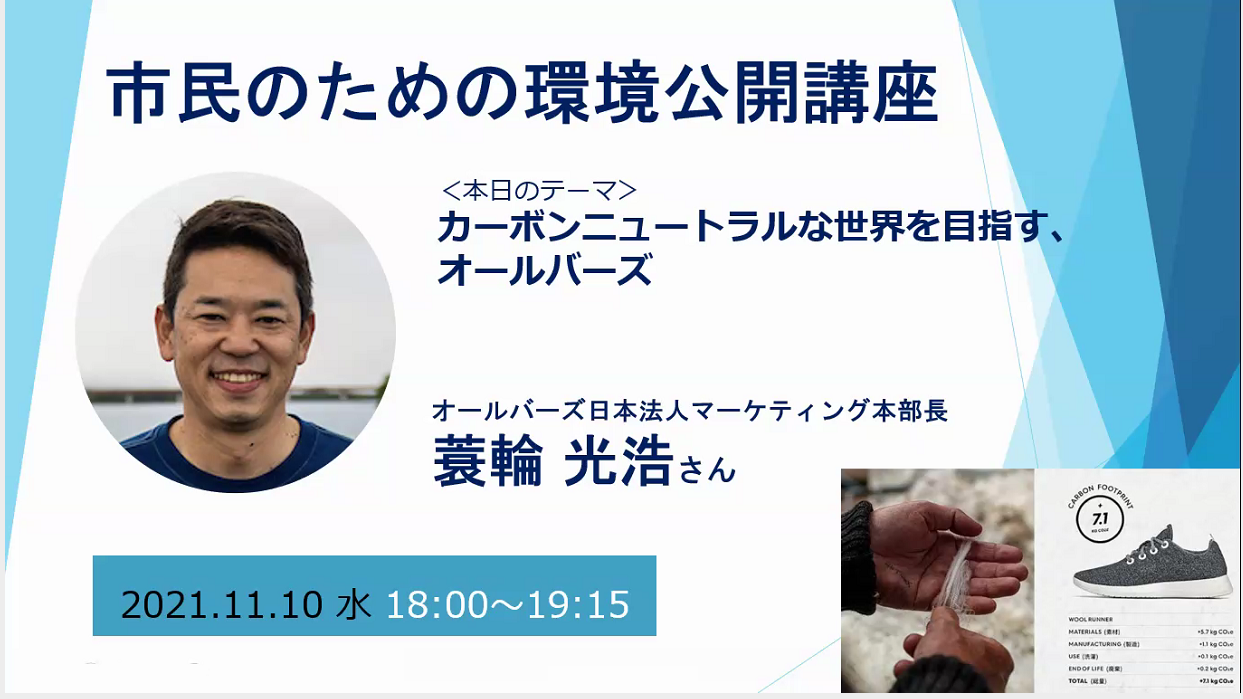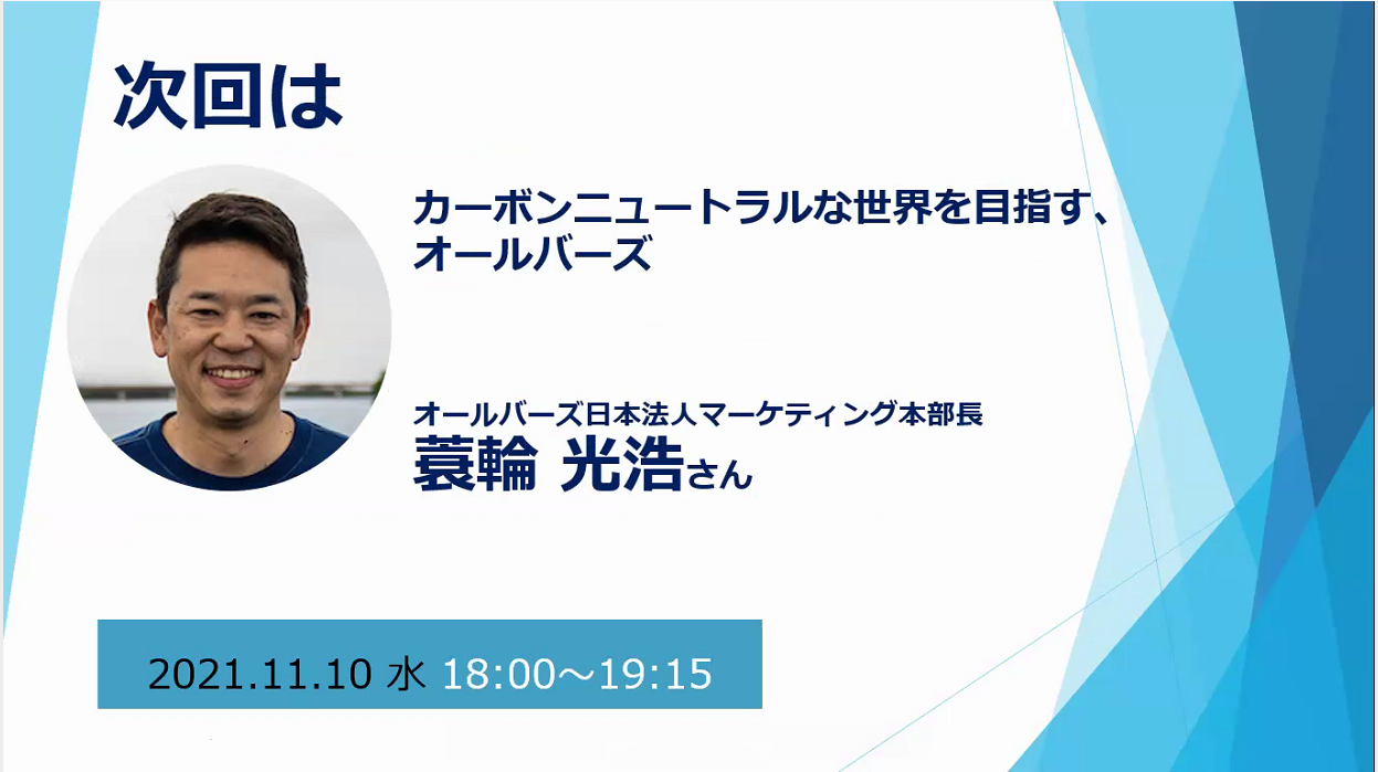 今回はPART2「企業が取り組むサステナビリティ」の第3回ということで、オールバーズ 日本法人マーケティング本部長の蓑輪光浩さんを講師に迎え、「カーボンニュートラルな 世界を目指す、オールバーズ」をテーマに講演いただきました。