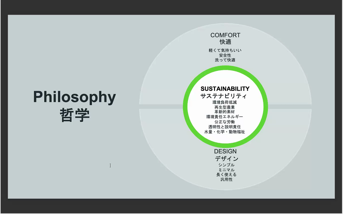 オールバーズの大きな特徴として、企業哲学の中心に「サステナビリティ」を据えていることが 挙げられます。オールバーズは「2030年カーボンニュートラル」を目指して(世界の目標 より20年早く!)、「ビジネスの力で気候変動を逆転する」と明言しています。 サステナは儲からない、という風潮が根強くありますが、ビジネスの力でこの常識と行動を変え、 しっかりと収益を上げながら持続可能な世界を実現することを目指しているとのことでした。