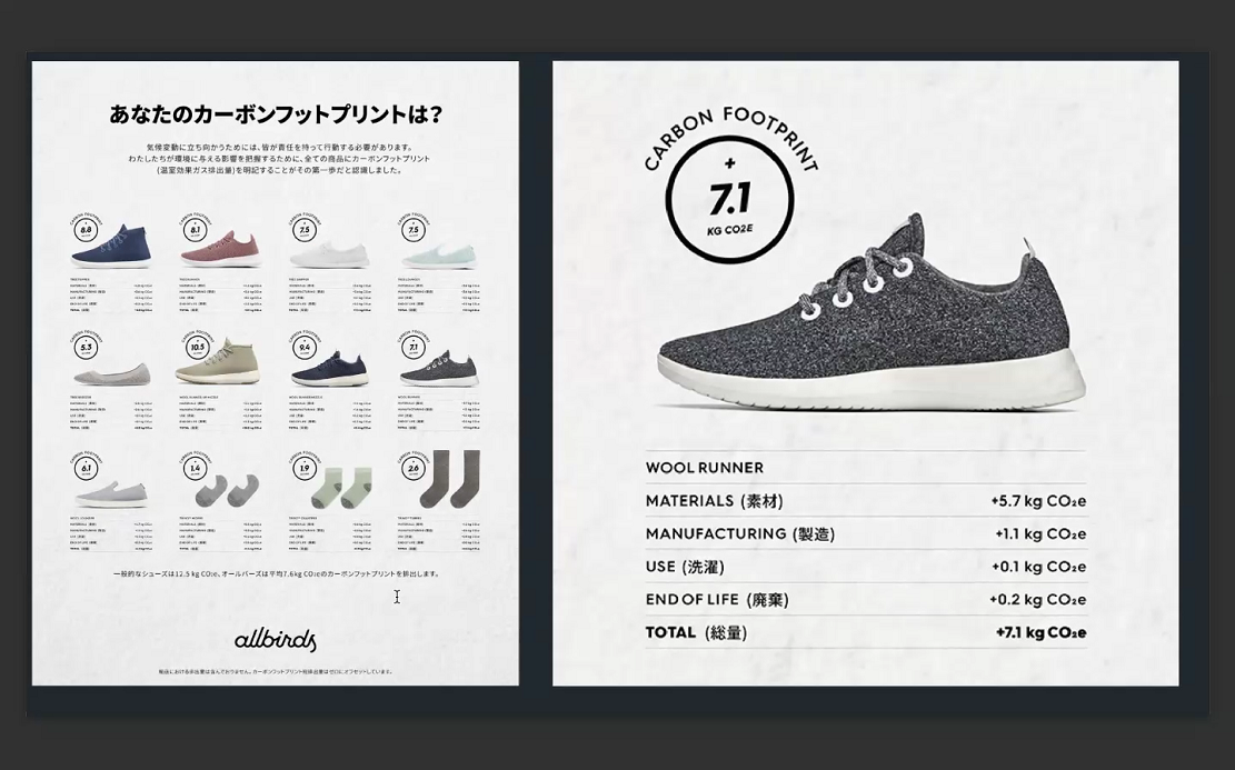 その目的を達成するため、ウール素材で洗濯ができる商品づくり(廃棄されないための工夫)、 商品ごとにカーボン・フットプリントを表示する(しかもカーボン・フットプリントが以前の 商品を上回るものは開発しない)、サトウキビ製のソール開発(オープンソース化して競業他社 にもノウハウ提供)、Bコーポレーションの認証取得など、これまでの常識に捉われない、 徹底した取り組みを行っています。