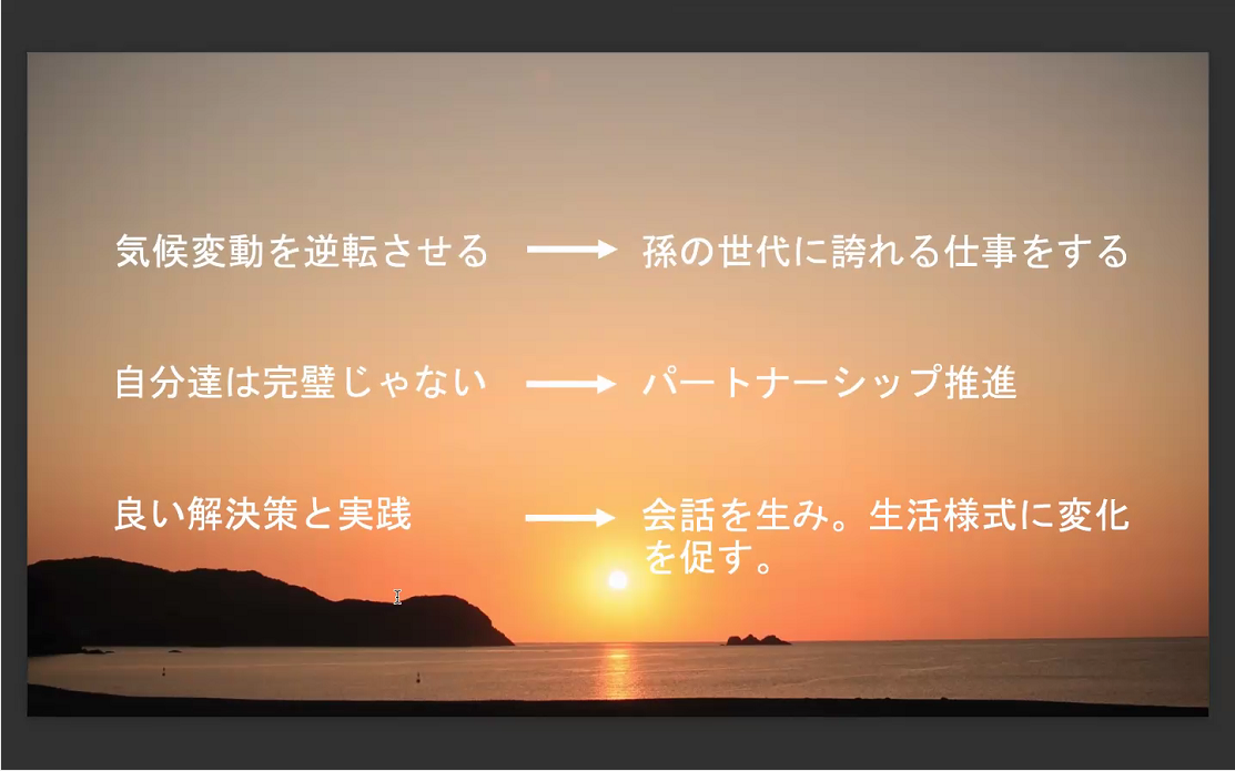 20年先を見据えたサステナビリティの取り組みは、「孫の世代に「何をしていたんだ」と 言われないように」という強い意志で臨んでいる、というお話はとても印象的でした。