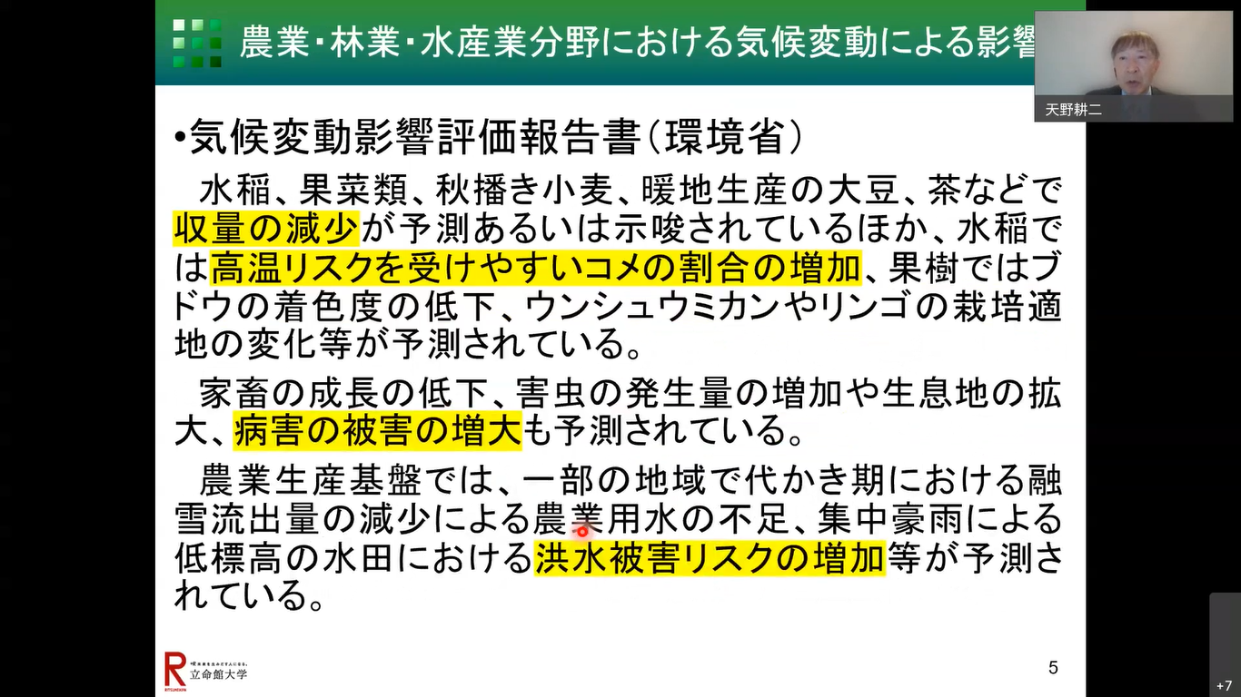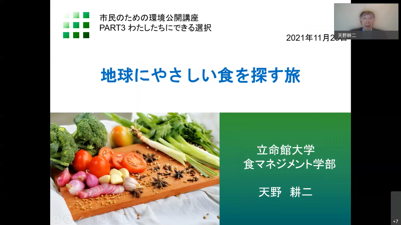第1回は11月23日(火)13時30分から(※)、「地球にやさしい食を探す旅」をテーマに、 立命館大学・食マネジメント学部教授の天野耕二さんに講演いただきます。 ぜひご視聴ください!