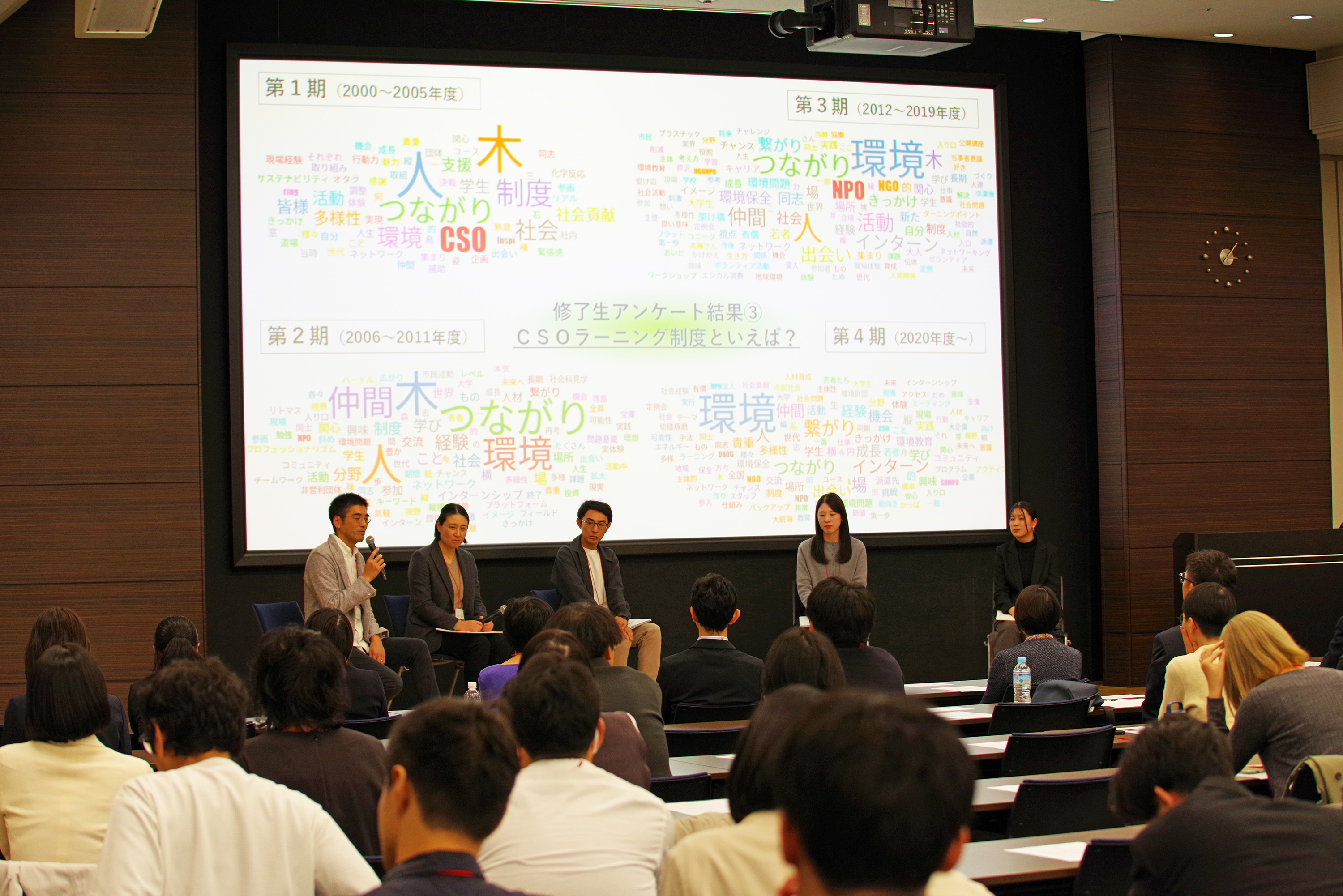 また、後半には修了生をパネリストとしたパネルディスカッションを行い、事前のアンケートで