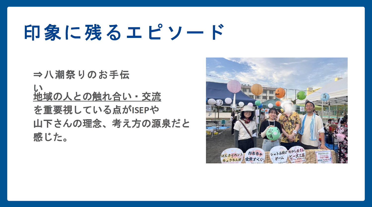 鈴木さんは八潮祭りのお手伝いをする中で、地域の人との交流がISEPの理念でもある