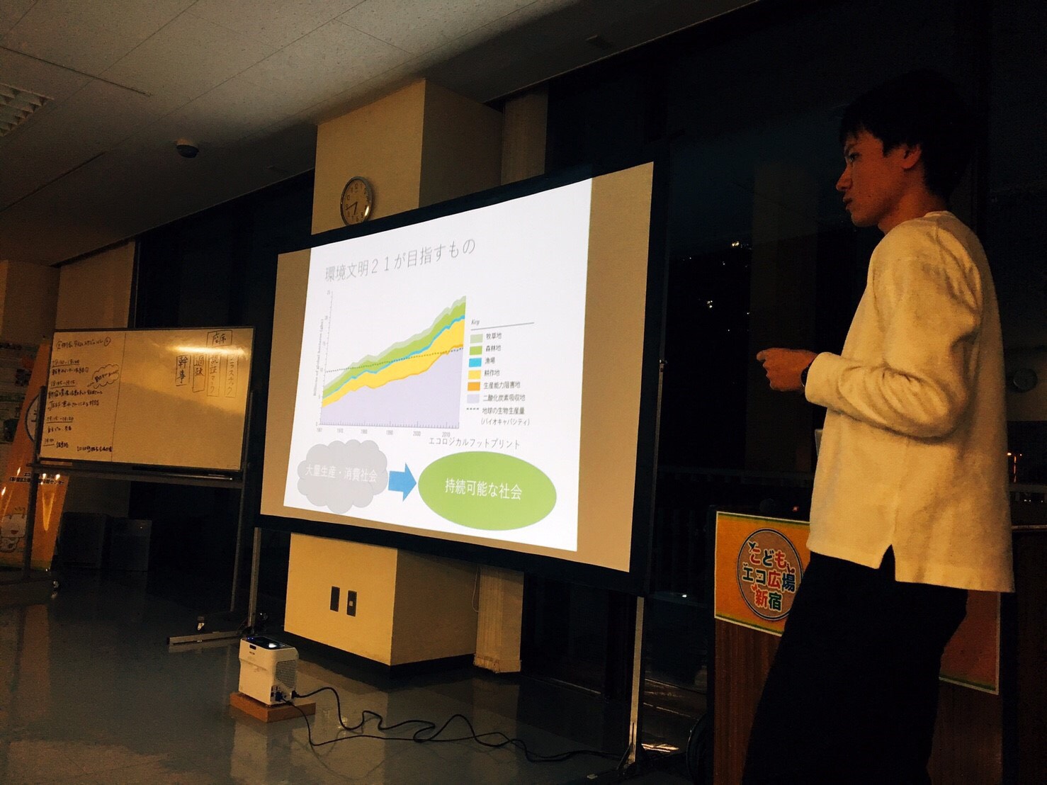 新宿環境活動ネットは関くん、村上さんが紹介してくれました。 主な活動としては、市民・市民グループ、 事業者、行政、学校・教育機関等の連携づくり、 そのネットワークを活かした環境教育やその支援を行っています。