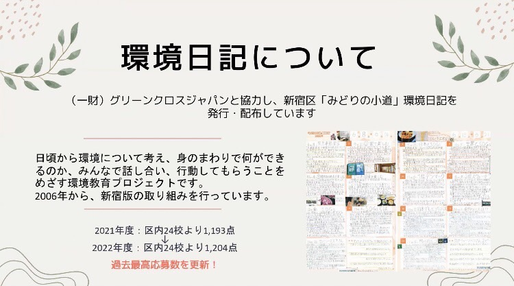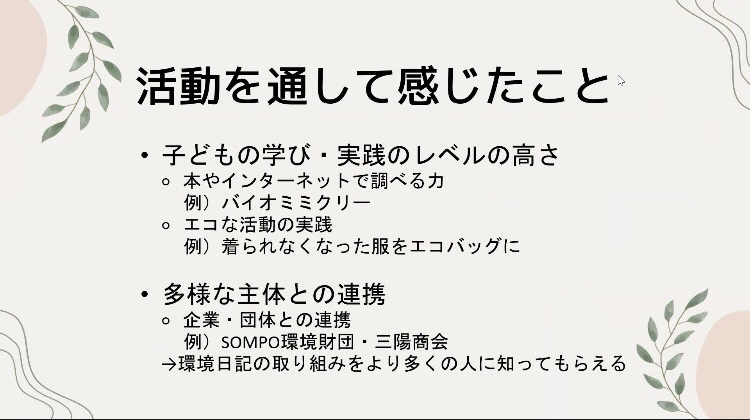 提出された環境日記の中から選ばれた作品の制作者に対して、オンライン授賞式を開催。
