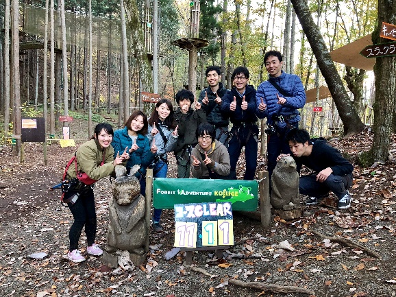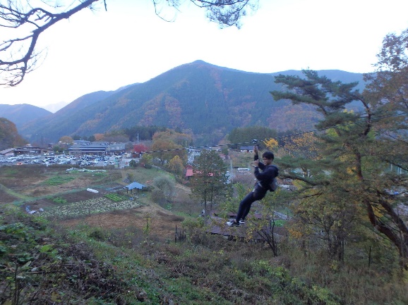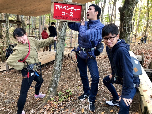 翌日は小菅村に戻り、フォレストアドベンチャーに初挑戦! しっかりと安全器具をつけて準備万端! アドベンチャーコースに挑みます。