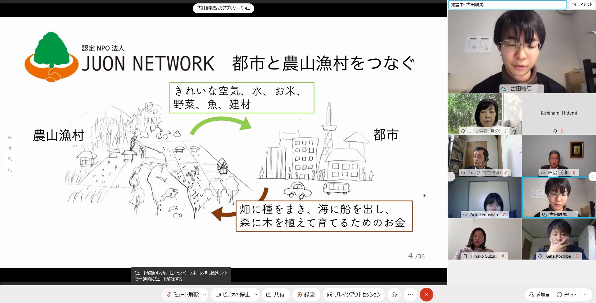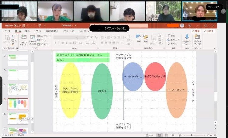 ワークの最後にはラーニング生からの感想や相談などの意見交換が行われました。とある感想では、農業やウミガメの保全などの活動も気候変動などの環境問題と密接に関わっており、CSO間でも活動内容に繋がりがあり面白いというものがありました。環境問題はとても大きな問題であるからこそ、一つの団体だけではなく、色々な団体が協力して取り組むことが重要であることを再認識しました。様々な団体に配属される学生達が、一堂に会するCSOラーニング制度は、CSO間の繋がりも生み出せる可能性がある制度だと、チューターになって初めて気が付きました。