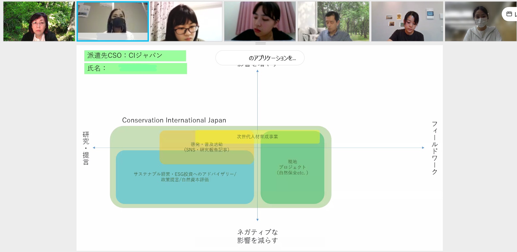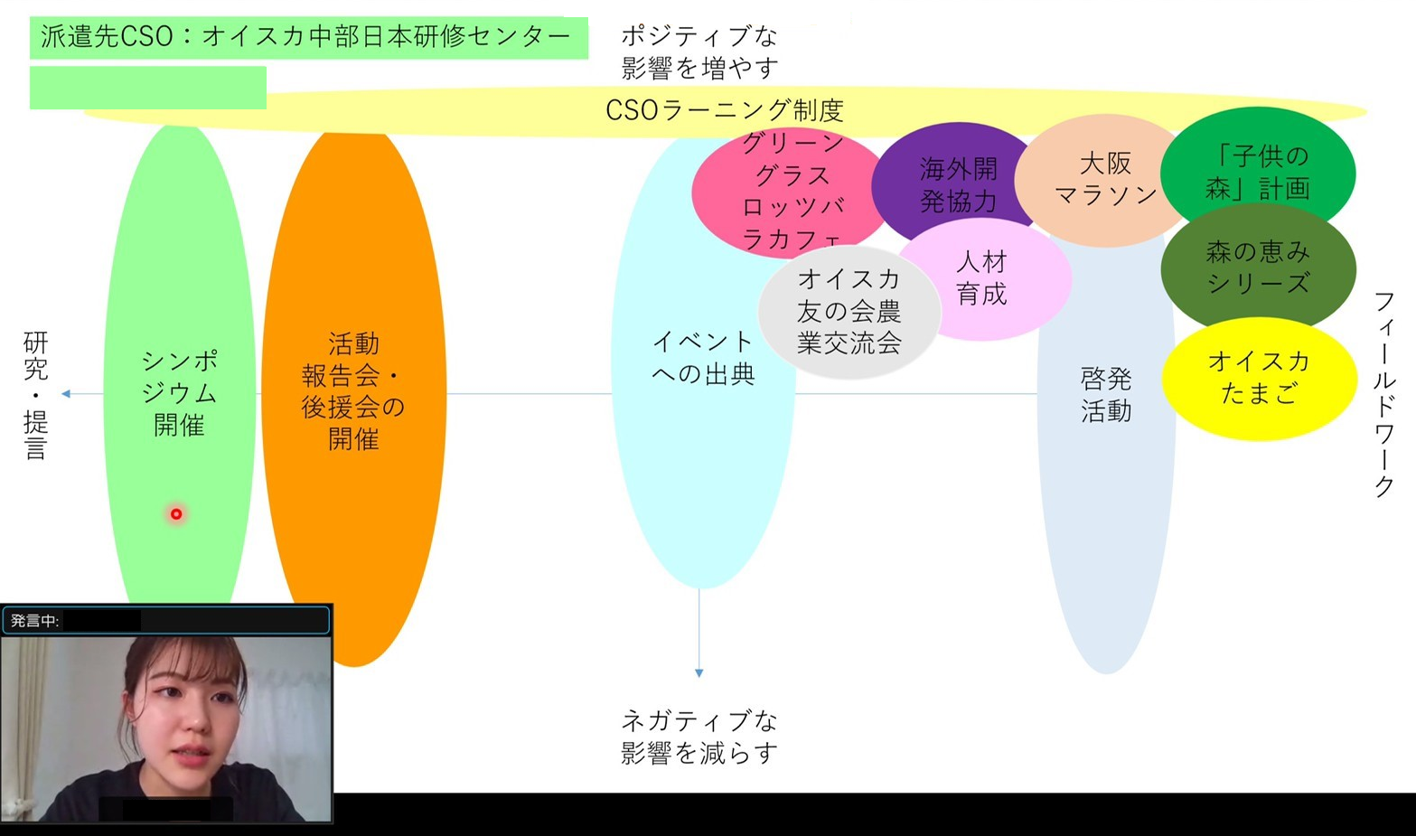 2番目の派遣先のCSOの紹介では、ラーニング生が事前に準備したスライドをもとに、派遣先のCSOの活動内容を発表しました。(詳しい内容や意図は関東地区のブログを御覧ください。)