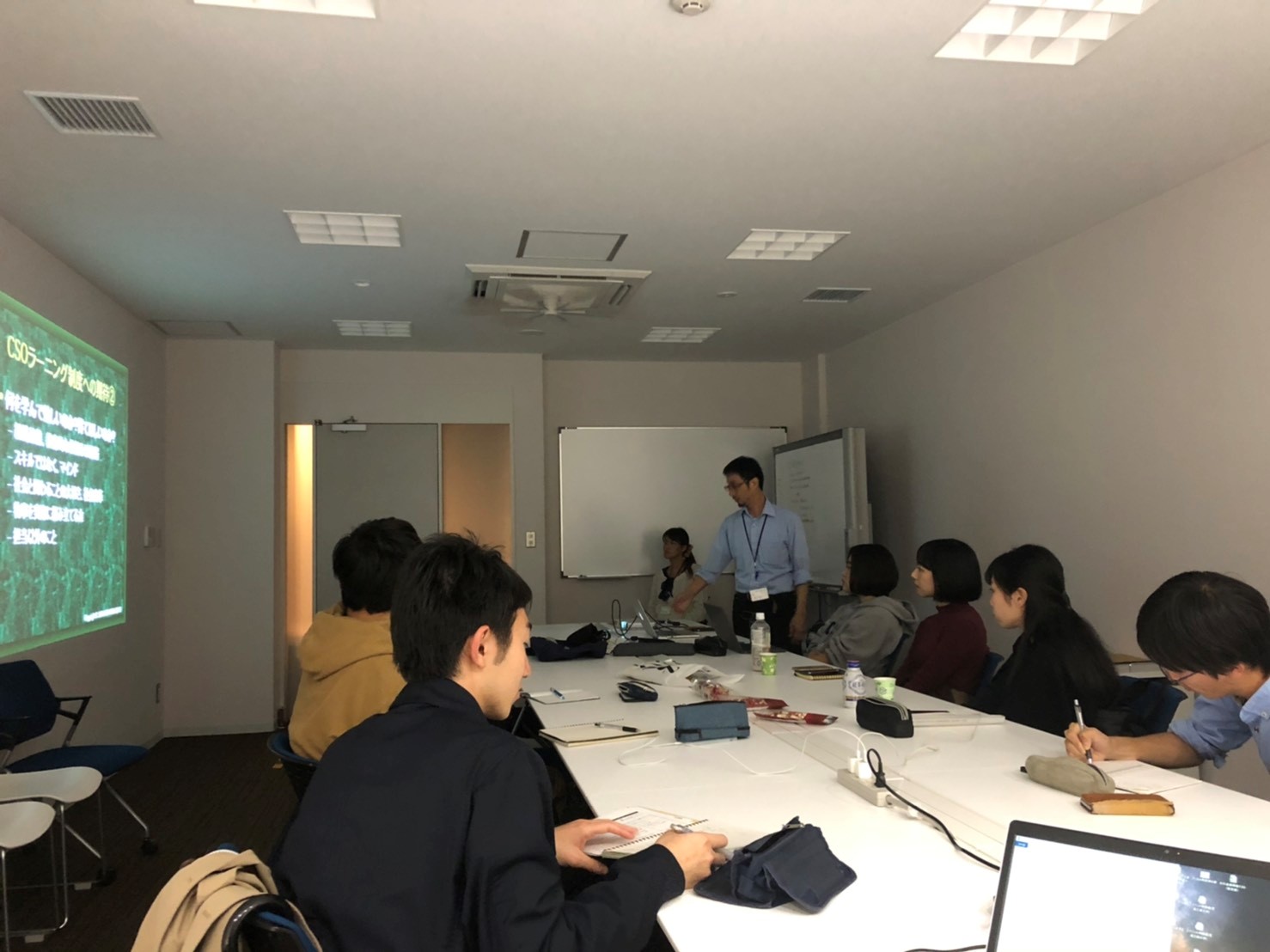 このイラストなら「○○○○○○○○○○のイラスト」という問題です。 (著作権フリーなので使わせてもらいました。正解は「ゴミを食べるウミガメ」です。) 一番印象的だったのは、タピオカのイラストですね。みんな頑張って答えていました。 続いて、JUON NETWORKの理事・事務局長の鹿住さんから団体紹介をしていただきました。 JUON NETWARKは、都市と農村漁村の人々のネットワークを結ぶことを通じて、 環境の保全改良や地方文化の発掘と普及、過疎過密の問題解決などを活動の軸として、 1998年に大学生協の支援を受けて誕生した団体です。 現在は、都市と農村漁村が支え合うネットワークを、 森林などをめぐる体験・交流・応援の活動によって広げ、 持続可能な社会を創造することを目的として活動しています。 活動事例として、「エコサーバー」という検定や青年リーダー養成講座などを通じた人づくり、 間伐材の利用を通じた企業・生協の森づくりなどを紹介していただきました。 その後、鹿住さんからCSOラーニング制度について、アドバイスもいただきました。 インターン生に期待していることは「学生・若者ならではの視点」であり、 基本的にインターン生がやりたいことをやりたいだけできる環境にしたいと おっしゃっていました。また、本制度から環境問題の解決のみならず、 何事においても大切な「継続は力」であることを学び取ってほしいと語っていました。 CSO生による活動共有の後に、自主プロジェクトについての話し合いが行われました。 環境財団の斉藤さんから、「最終形を意識して活動を進めてください」とのご指摘。 今までの活動を反省しながら、今後に向けて有意義な改善がなされた模様です。 今後の活動に期待ですね!