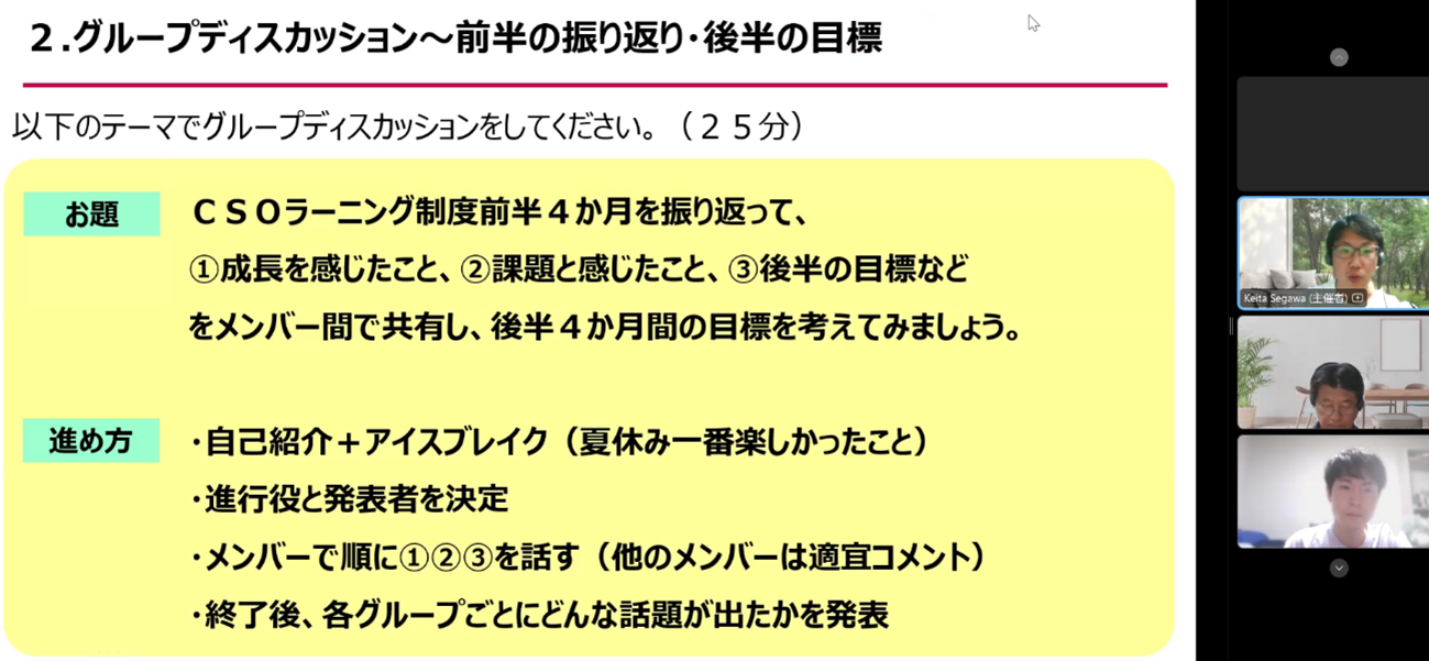 CSOラーニング制度の前半4ヶ月を振り返り、次のようなテーマで話し合いが行われました。
