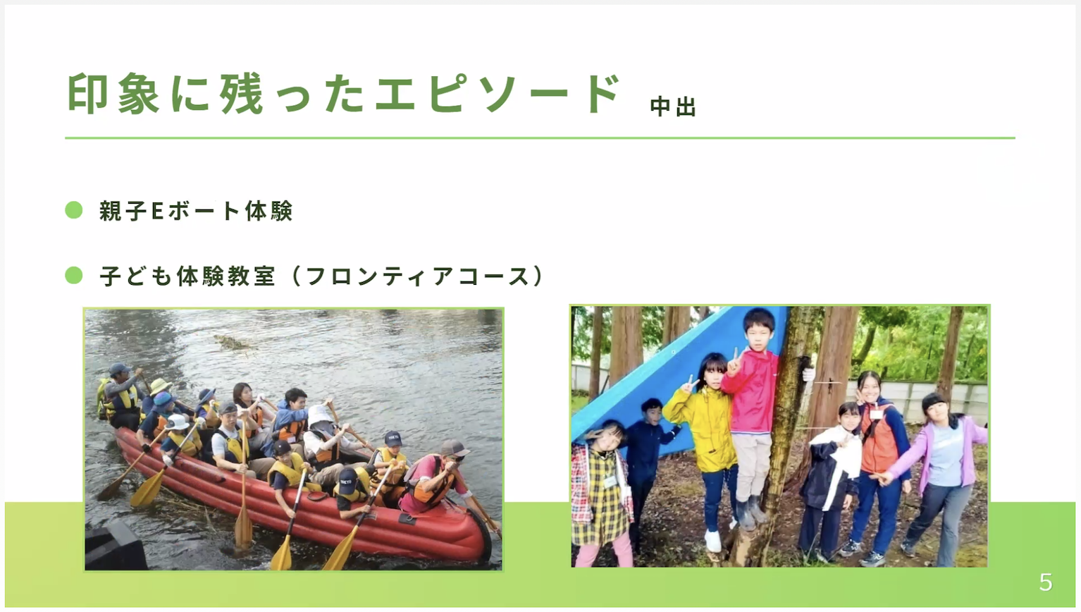 中出さんは、「親子Eボート体験」を挙げ、親子で楽しみボートの中で一体感が生まれて