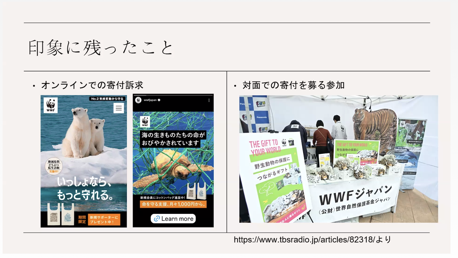印象に残ったこととして対面で寄付を募る活動を挙げ、立ち止まって話を聞いてもらう
